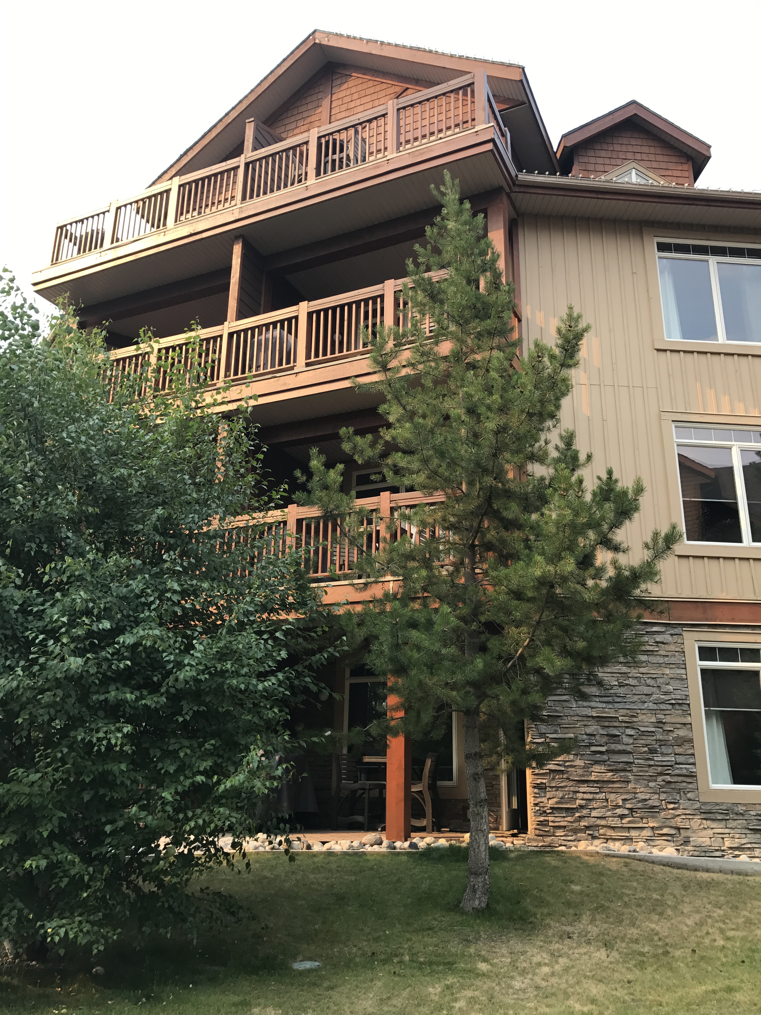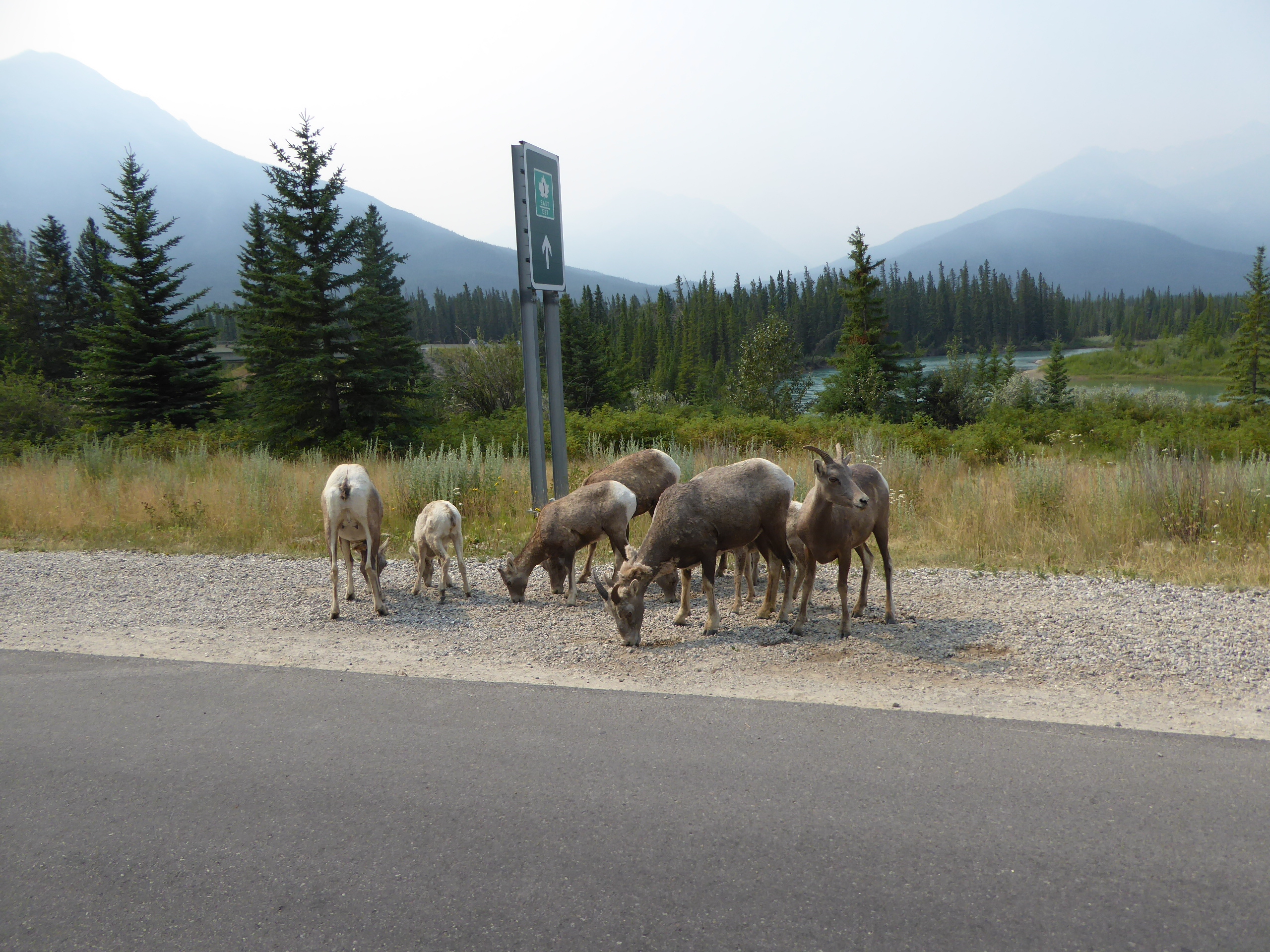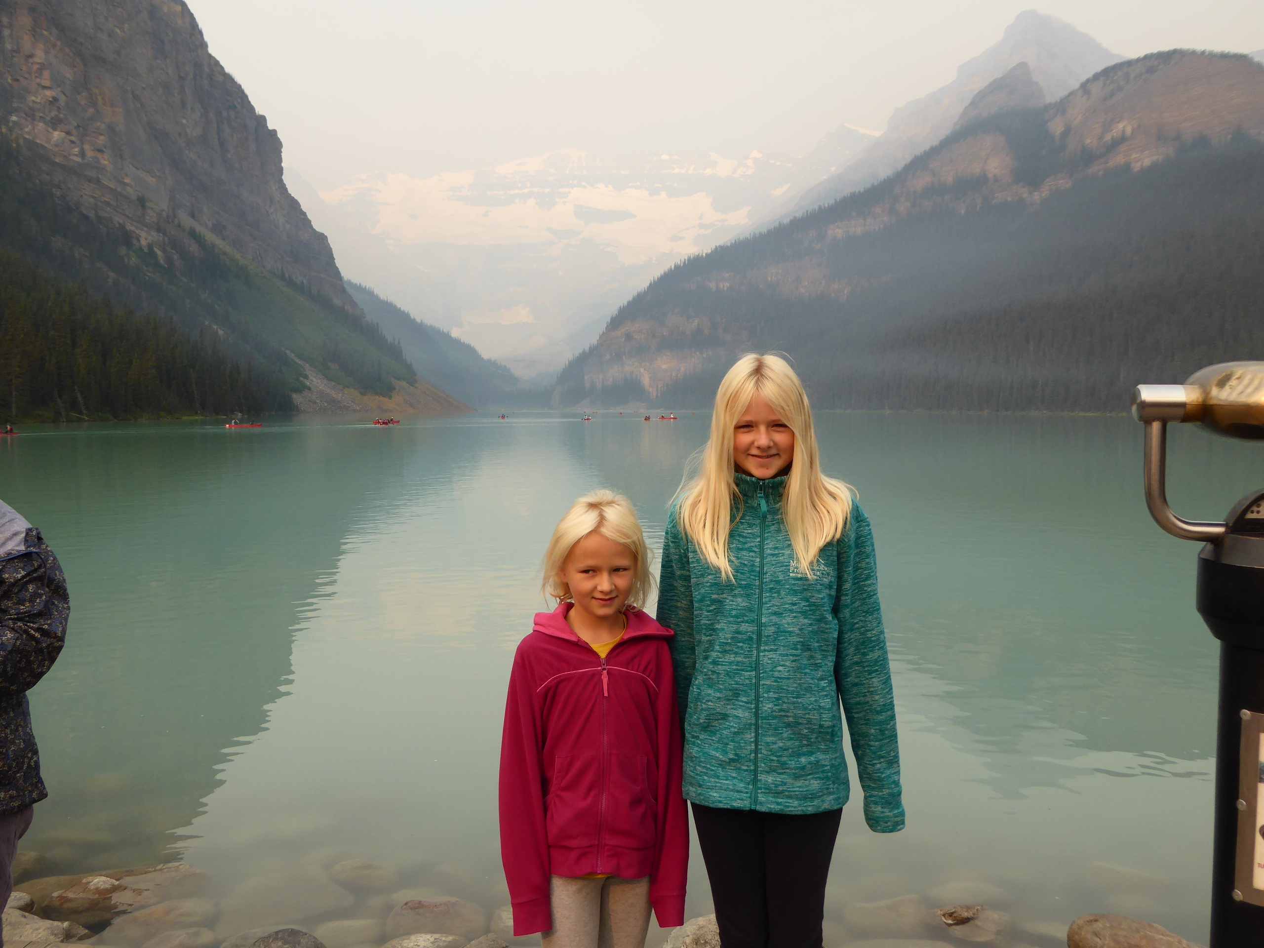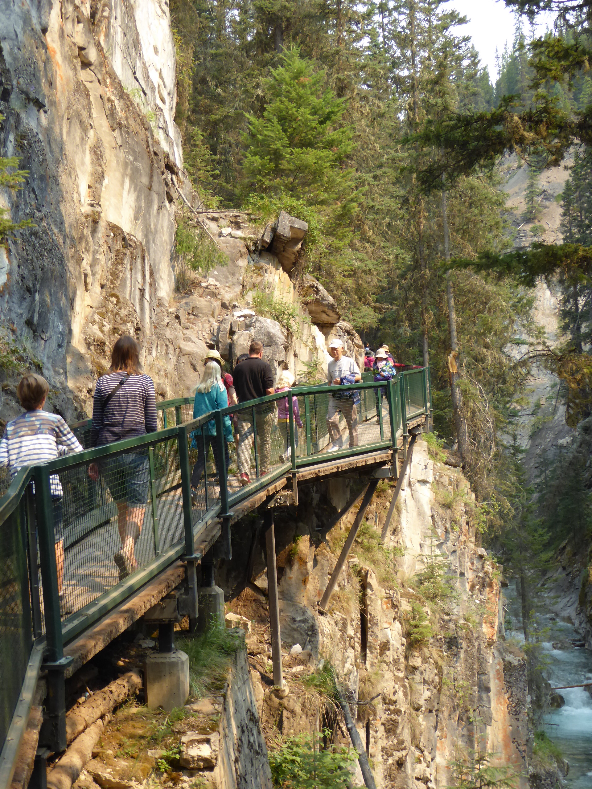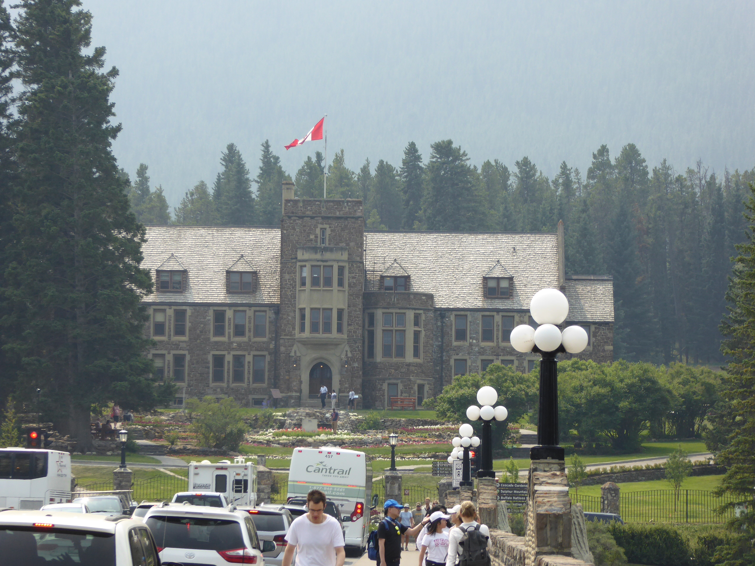 Wir standen recht früh auf, um noch zum Moraine Lake und zum Lake Louise fahren zu können, da dort immer schon sehr früh Stau bzw. überfüllte Parkplätze herrschen, den x Tausenden Chinesen und Koreanern zum Dank, die sich hier tummeln. Tatsächlich war die Zufahrt zum Moraine Lake schon nicht mehr möglich; aber auch Lake Louise präsentierte sich in ganz schlechtem Nebellicht. Das ganze Tal war zunehmend mit Dunst und Rauch gefüllt, da weiter im Süden immer noch Waldbrände herrschen. Wir fuhren über die alte Nebenstrecke bis Banff mit Halt im Johnston Canyon (rate: seehr viele Koreaner). Leider aber keine Elche oder Bären. In Banff gingen wir zum ersten Mal in diesen Ferien richtig ausgiebig shoppen. Nein, halt. Banff ist sehr Shopping-freundlich, auch für Männer. Vor JEDEM Laden steht eine Bank. Warum wohl hat Martin heute Abend einen Sonnenbrand? Es war dann noch ein Katzensprung bis Canmore, wo wir eine tolle, vollausgestattete Lodge haben und auf dem Grill einen Lappen, ähh, ein Fleisch gegrillt haben. Zum Dessert gabs Blaubeeren vom Busch vor unserem Terrassenplätzchen.